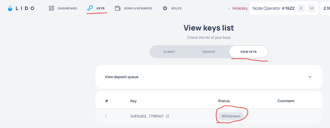 4\) Navigate to `Keys`>>`View Keys` to verify that the status of your validator key is marked as `Withdrawn`