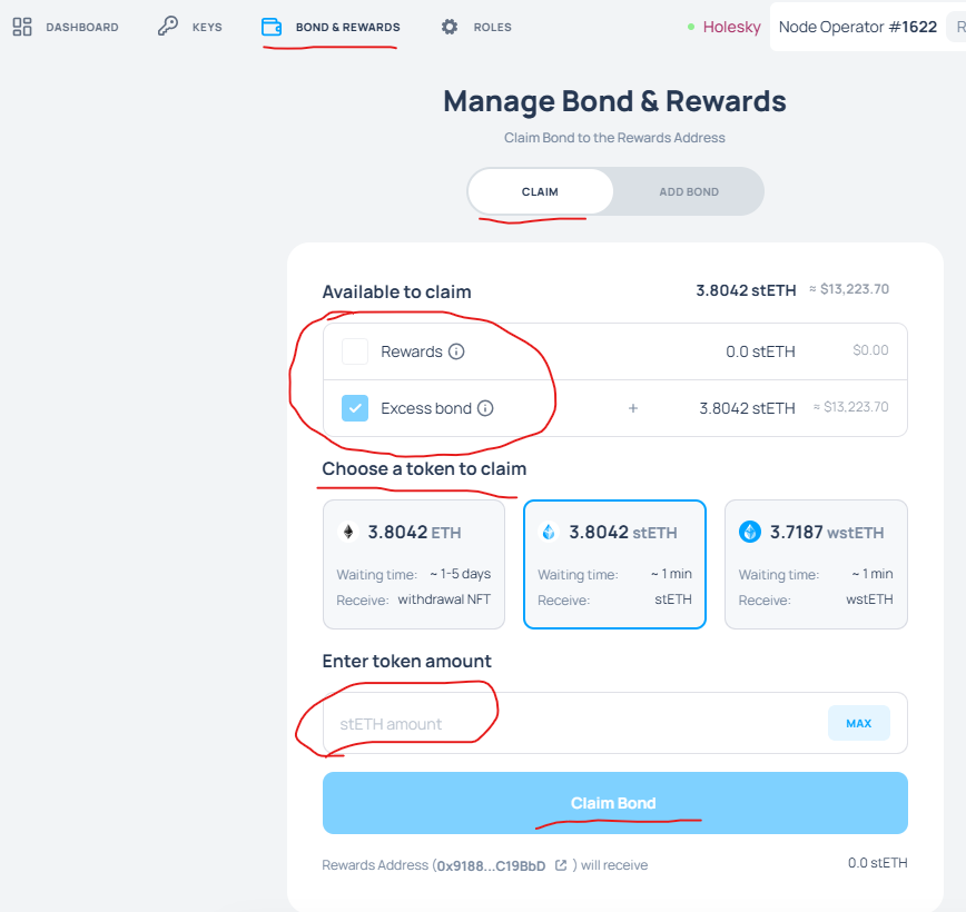 5\) Navigate to `Bond & Rewards`>>`Claim` to claim your deposited bond and any accumulated rewards