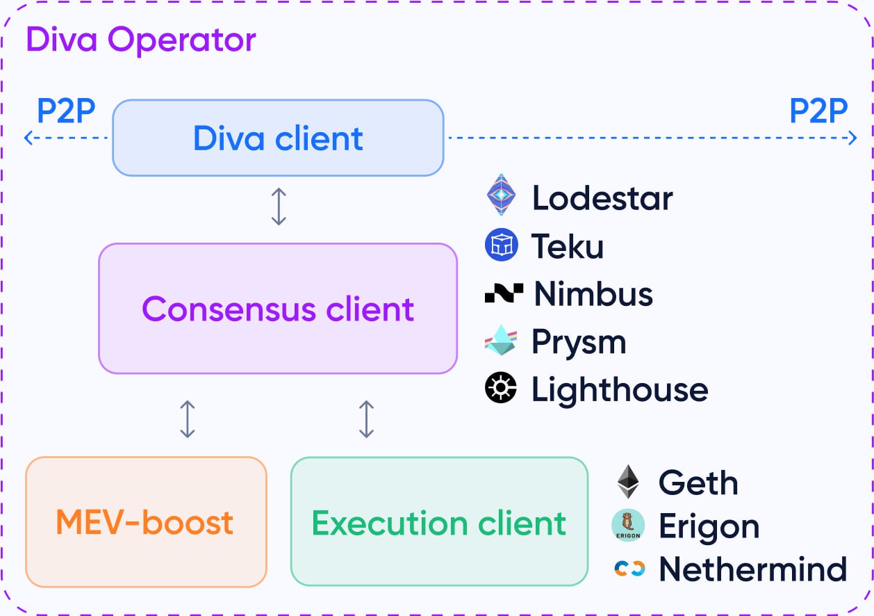 4. &#x20;The Diva client comes together with a Prysm validator client - indicated as "Diva client" in the diagram below. Together, they sit on top of and connects to your execution + consensus client set via the , replacing the need for you to run your own validator client for this purpose