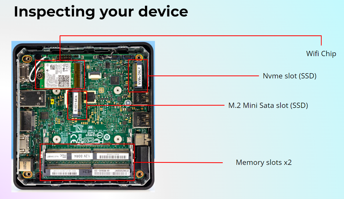 <figure><img src="https://content.gitbook.com/content/oML8XLjdWBoYbtGBoQ9R/blobs/lMoHdHLrySGHZhZWGNas/image.png" alt=""><figcaption><p>Basic anatomy of the Intel NUC device</p></figcaption></figure>