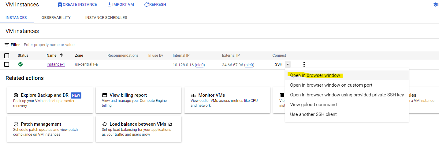 &#x20;Click on the dropdown beside the **"SSH"** column and select **"Open in browser window".** Click on **"Authorize"** when prompted.