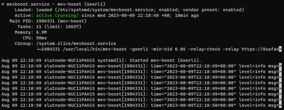 Expected output: The output should say MEV Boost is “active (running)”. Press CTRL-C to exit and MEV Boost will continue to run.