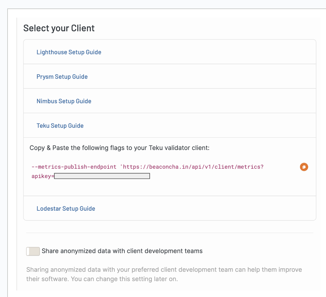 Select your consensus layer client from the list and copy the resulting flag with your own unique API key. As you can see, I have redacted my API key below and you should also make sure not to reveal yours.