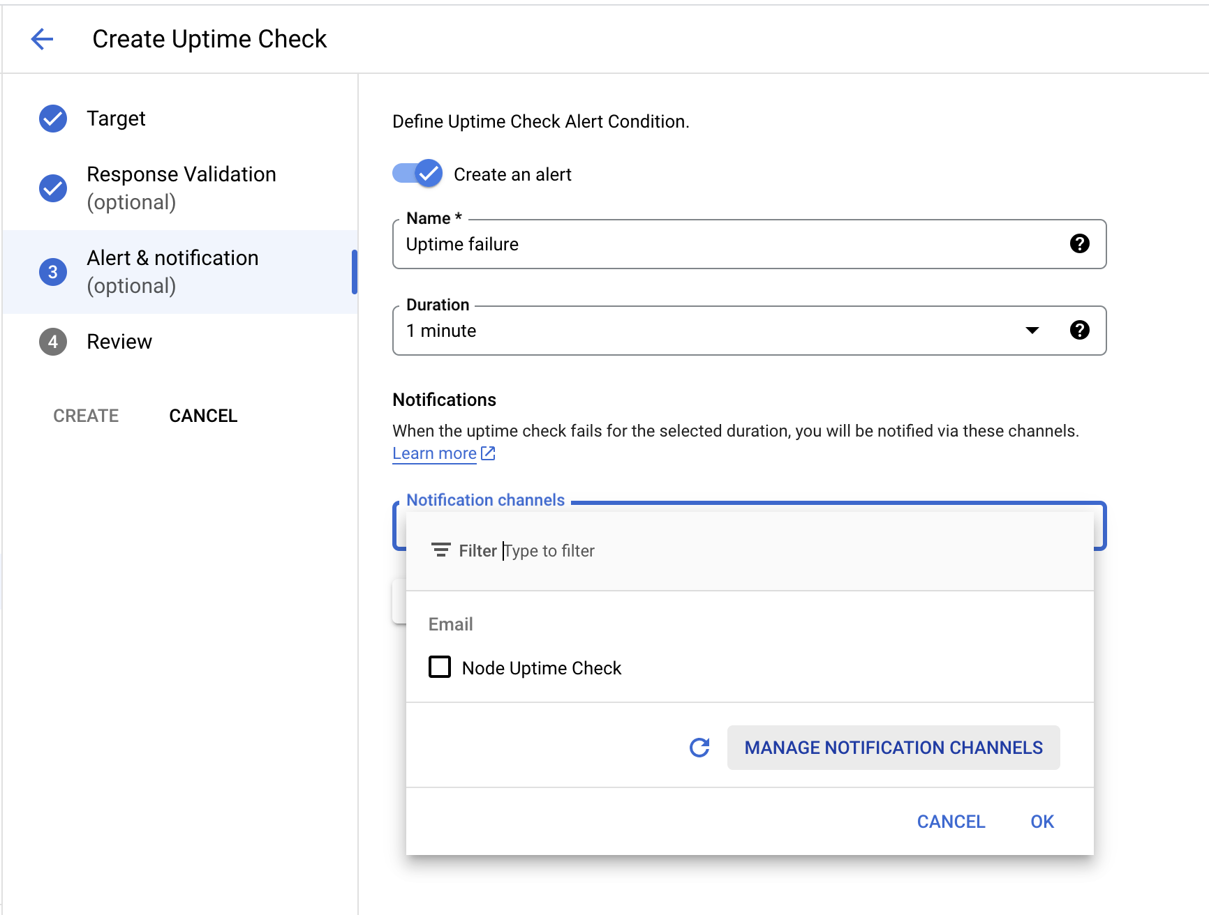 Click through the default settings until Step 3 - Alert & Notification. Then click on the "Notification channels" drop down and then "MANAGE NOTIFICATION CHANNELS"