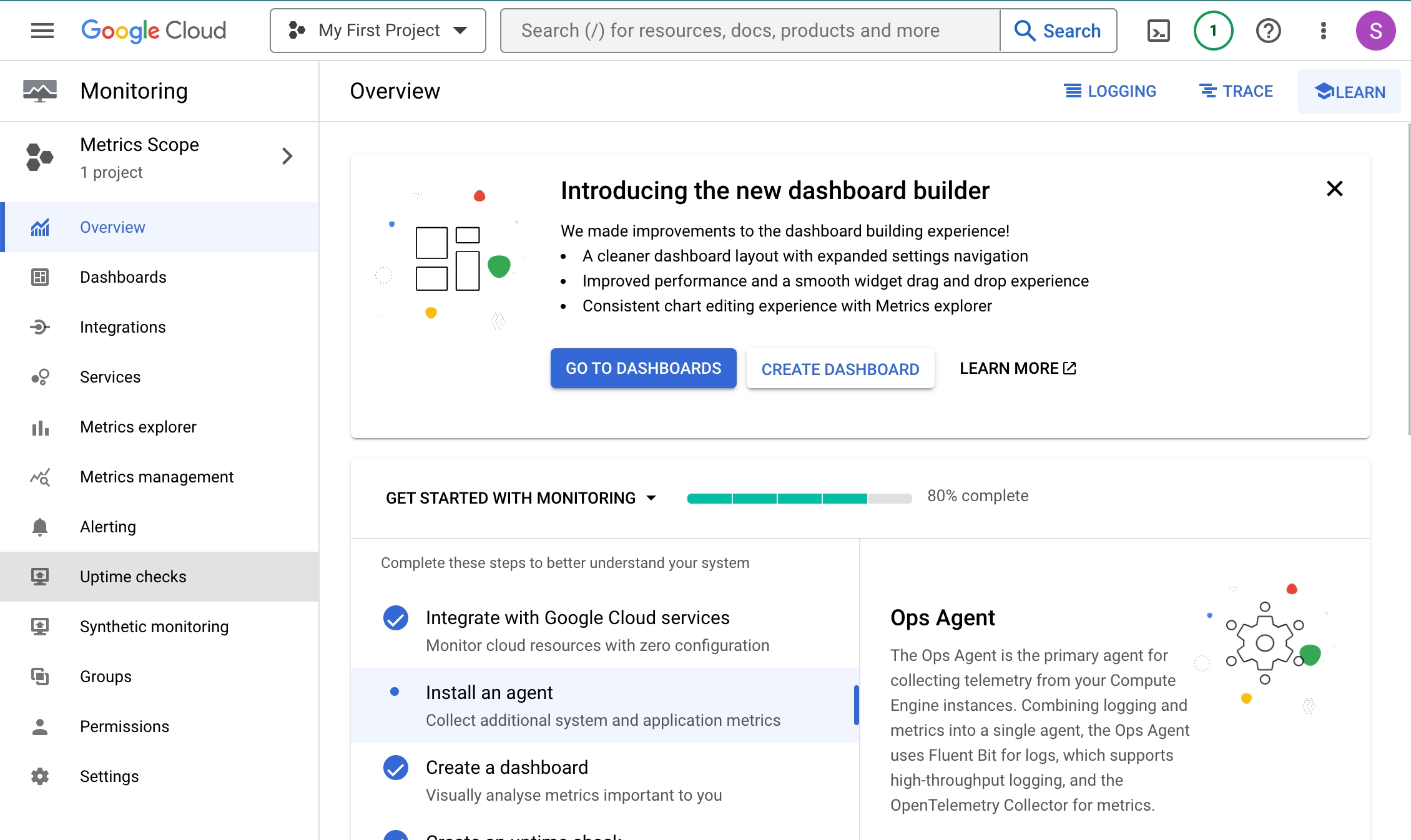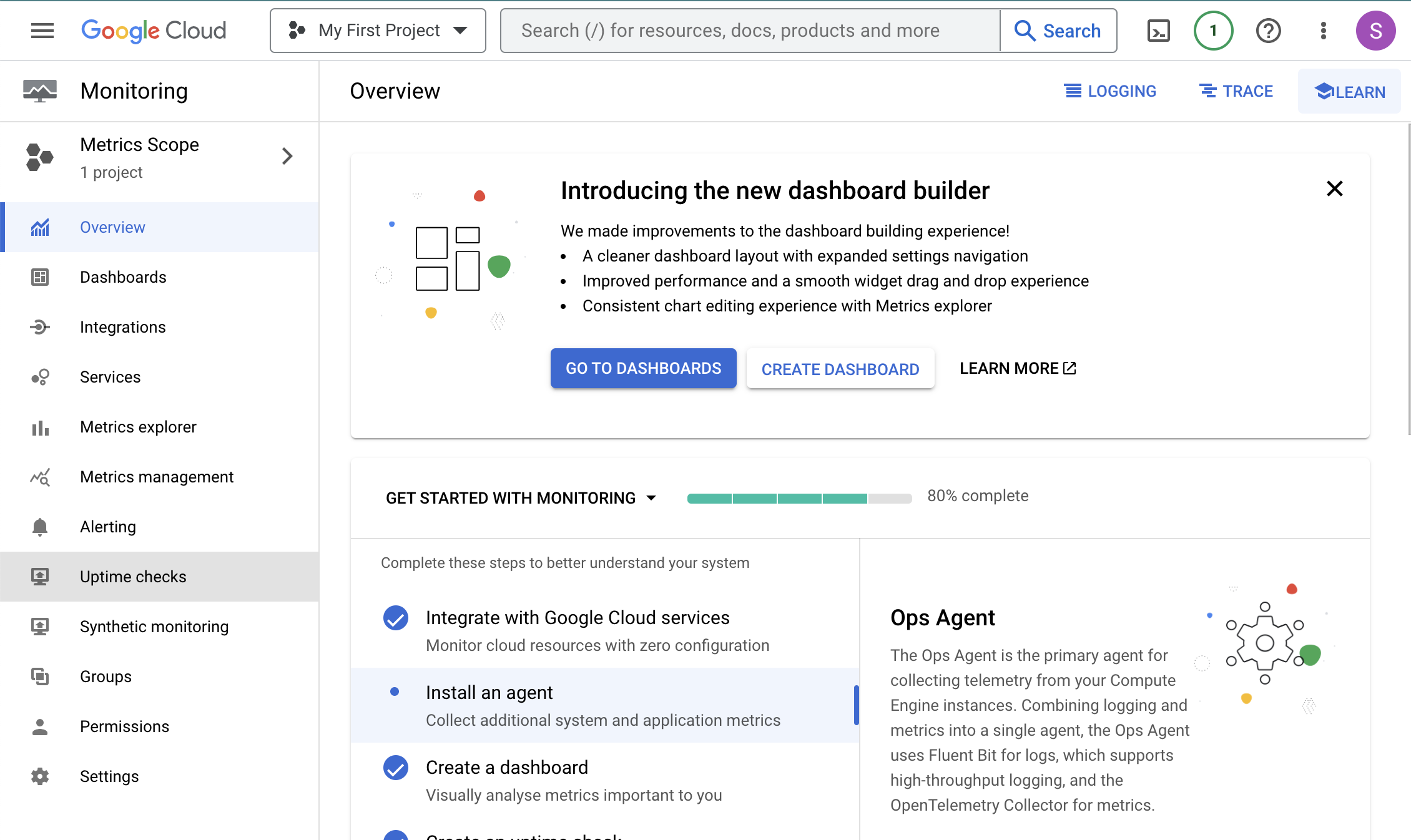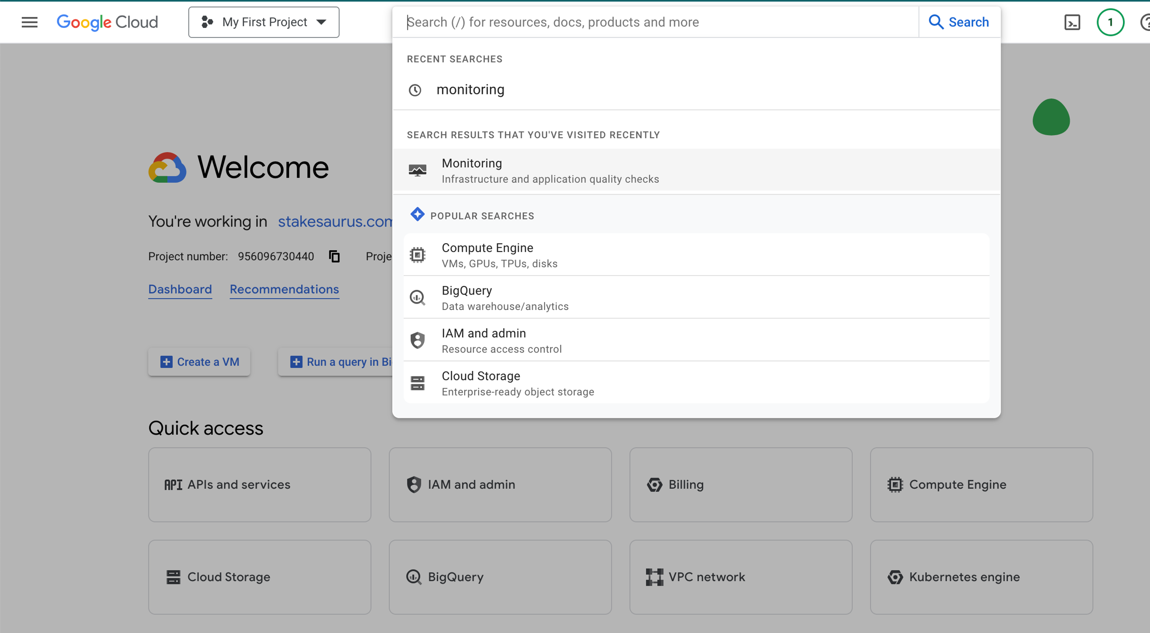 Log in to your google cloud console and type "monitoring" into the search bar. Then select the "Monitoring - Infrastructure and application quality checks" result.