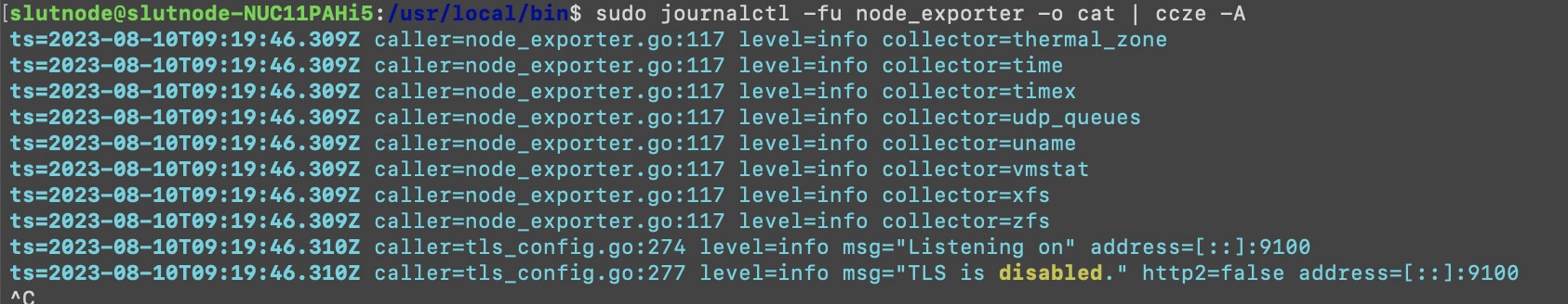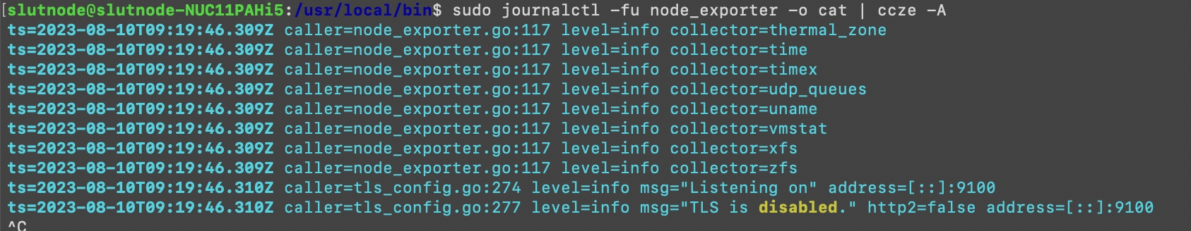 sudo journalctl -fu node_exporter -o cat | ccze -A