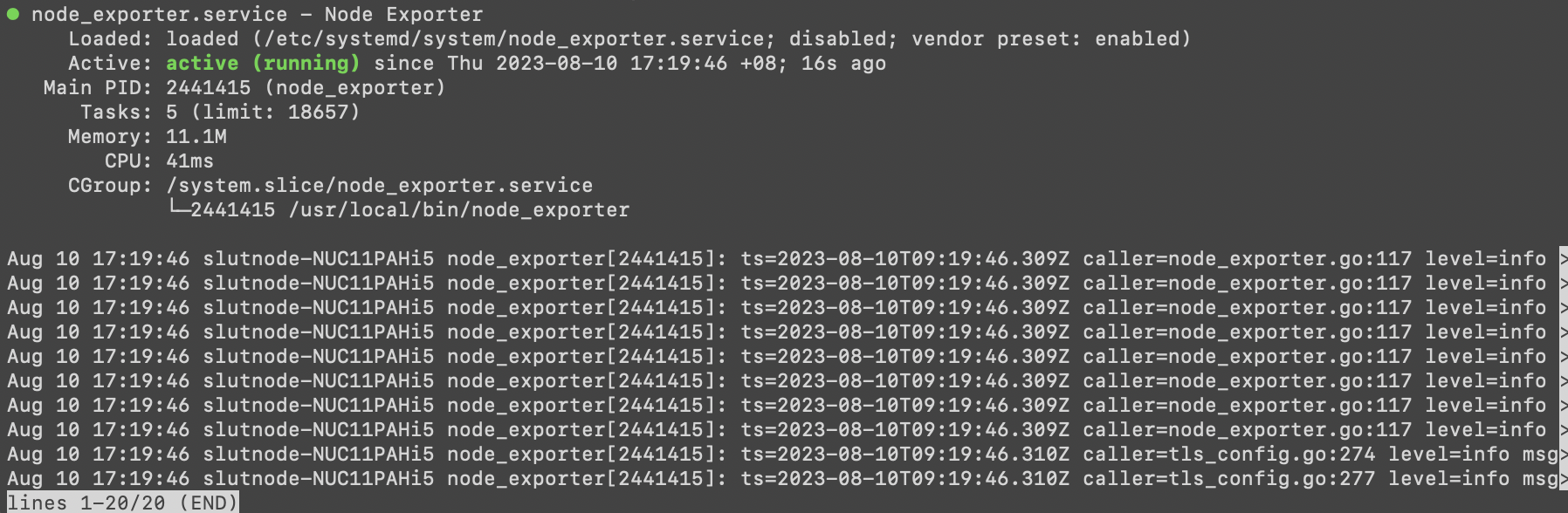 <figure><img src="https://content.gitbook.com/content/oML8XLjdWBoYbtGBoQ9R/blobs/fVfEYBKnORUOvRFhhgrO/Screenshot%202023-08-10%20at%205.20.13%20PM.png" alt=""><figcaption><p>sudo systemctl status node_exporter.service</p></figcaption></figure>