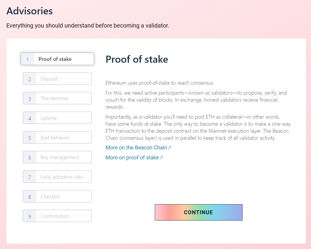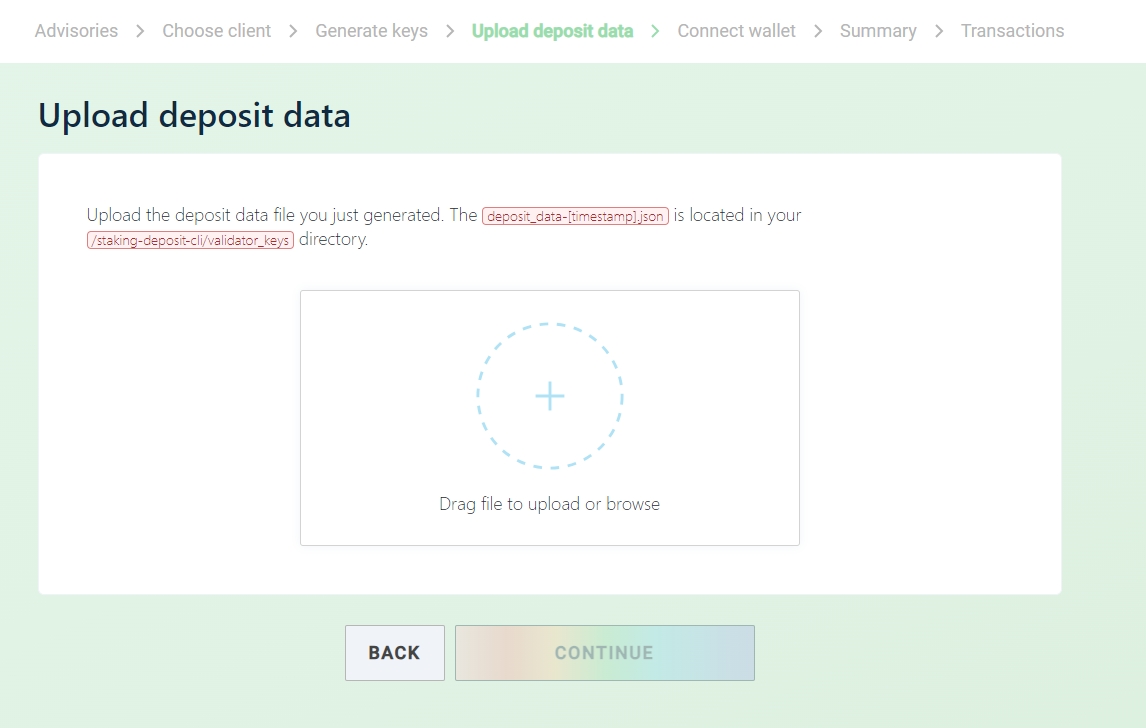 Continue clicking through until you reach the "Upload deposit data" section. Don't worry about the "Choose client" and "Generate keys" sections as you would already have dealt with those if you followed this guide in order.